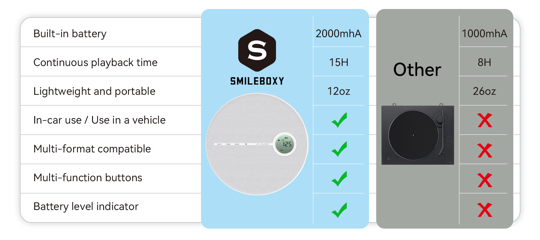The Smileboxy CD player features a high-performance battery, allowing you to enjoy music for extended periods without frequent recharging. Whether at home, in the office, or in the car, its long-lasting battery ensures uninterrupted playback, keeping music with you every moment.