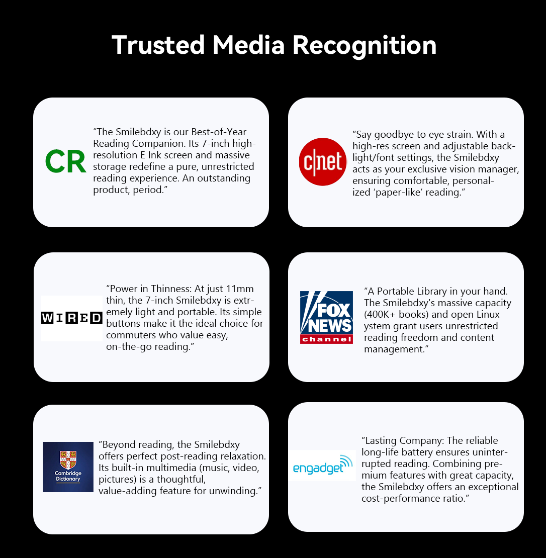 Thus, Smileboxy was born. The brand emphasizes lightweight portability, eye-friendly display, and powerful performance, featuring a 7-inch glare-free screen, 2500mAh long-lasting battery, and a vast built-in library—allowing users to enjoy a clear, comfortable, and uninterrupted reading experience wherever they go.